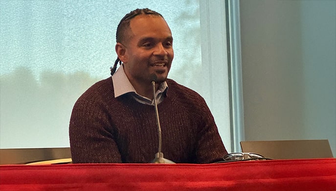 Michelle DiMarzo ’07, PhD, the museum’s curator of education and academic engagement, introduced the panel of speakers which included Sonya Huber, PhD, professor of English and editor of the Dogwood literary journal; Don C. Sawyer III, PhD, vice president of diversity, inclusion, and belonging, and an associate professor in the Department of Sociology and Anthropology; Gifton Bagalloo, a formerly incarcerated student in Dr. Sawyer’s Second Chance Education Alliance classes; Rev. Kevin O’Brien, S.J., vice provost and executive director of Fairfield Bellarmine; and Gregg Caruso, PhD, director of the Patrick J. Waide Center for Applied Ethics and a professor of ethics and management.